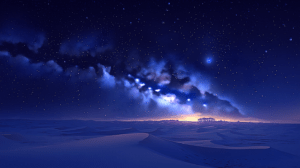 見渡す限りの砂漠に満天の星空、天の川が地平線まで続き無数の星が砂の上に光を落とす、砂丘の稜線が星明かりに照らされ青白く輝く、遠くに小さなオアシスの木々のシルエット、空気が透き通るような乾いた夜の静寂、宇宙と大地の壮大なスケール感、ディープネイビーとパープルとゴールドの配色、写実的な星空風景イラスト、最高品質、超高精細、8K