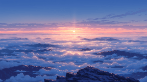 険しい山頂から見下ろす広大な雲海、地平線から昇り始める太陽が雲の海をピンクとオレンジに染める、山の稜線が朝焼けの光に輝き、周囲の山々が雲の上に島のように浮かぶ、静寂と荘厳さが支配する山岳の夜明け、天と地の境界が曖昧になる幻想的な高山の風景、コーラルピンクとゴールドとディープブルーの配色、精緻な山岳風景イラスト、最高品質、超高精細、8K