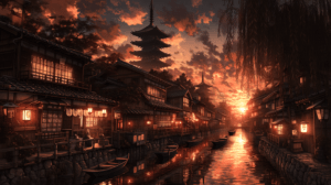 夕暮れ時の静かな川沿いに立ち並ぶ古い木造建築、橙色と朱色に染まった空が水面に鮮やかに映り込む、石畳の細い路地に提灯の明かりが灯り始める、遠くに五重塔のシルエット、川面を漂う小舟と波紋、風にそよぐ柳の枝、郷愁と静けさが漂う和の夕景、バーントオレンジとディープレッドとゴールドの配色、精緻な和風風景イラスト、シネマティックライティング、最高品質、超高精細、8K
