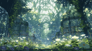 ガラス張りの大きな温室が廃墟となり、割れたガラスの天井から雨と陽光が差し込む、倒れた棚や錆びた柵を覆うように様々な花が咲き乱れる、蔦が建物全体を包み込み、蝶や小鳥が自由に飛び交う、人の手を離れ自然に還りつつある空間の静かな美しさ、グリーンとホワイトとラベンダーの配色、幻想的な廃墟風景イラスト、柔らかな自然光、最高品質、超高精細
