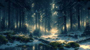夜明け前の薄暗い北欧の針葉樹林、地面を這う白い朝霧が木々の間を漂う、苔むした岩と倒木に露が光る、木々の隙間から差し込む最初の陽光が霧を金色に染める、遠くに凍った湖面が微かに光る、静寂と冷気が漂う神秘的な夜明けの森、深いグリーンとホワイトとゴールドの配色、幻想的な自然風景イラスト、ボリュメトリックライティング、最高品質、超高精細