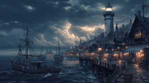 黒い嵐雲が迫る港町の夕暮れ、荒れ始めた海面に漁船が揺れ、波止場の石畳が雨で濡れ始める、古い灯台が点灯し白い光が暗い海を照らす、店を閉める人々と吹き荒れる風、嵐の来る直前の張り詰めた空気、ダークグレーとアンバーとホワイトの配色、ドラマティックな気象風景イラスト、シネマティックライティング、最高品質、超高精細