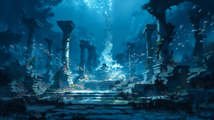 深い青の海底に沈む古代の神殿遺跡、崩れた石柱や階段に珊瑚と海藻が茂る、遺跡の中心から神秘的な青白い光の柱が海面へ向かって伸びる、周囲を色とりどりの熱帯魚の群れが泳ぎ回る、水面からの光が揺れながら差し込む、神秘と静寂が共存する深海の景色、アクアブルーとティールとゴールドの配色、幻想的な水中風景イラスト、最高品質、超高精細