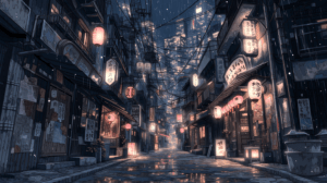 雨上がりの夜の東京の細い路地、ぬれた石畳にネオンサインと提灯の光が鮮やかに反射する、古いビルの外壁に貼られたポスターと錆びた看板、電線が複雑に絡み合い空を細く切り取る、路地の奥に小さな居酒屋の暖かな光、湯気と雨の匂いが漂う夜の街の情景、ブルーとピンクとアンバーの配色、精緻なアーバン風景イラスト、シネマティックな光と影、最高品質、超高精細
