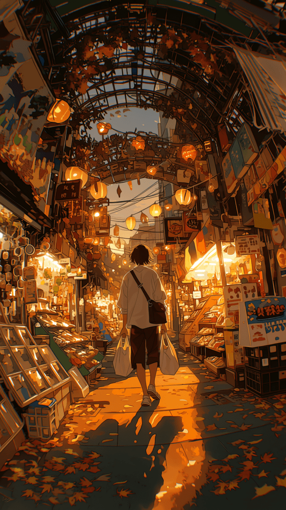夕方の商店街プロンプト|買い物帰りの生活感をAIイラストで表現する