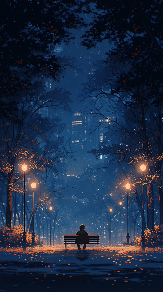 街灯の下、夜の公園のベンチで一人静かに座っている人物のシーンです。仕事帰りや散歩の途中のような、一人時間の孤独感と解放感を描きます。